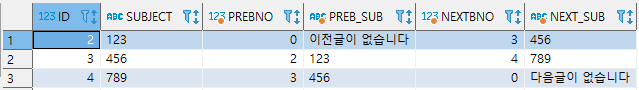 "LEAD(subject, 1, '다음글이 없습니다') OVER (ORDER BY ID ASC) AS NEXT_SUB " +