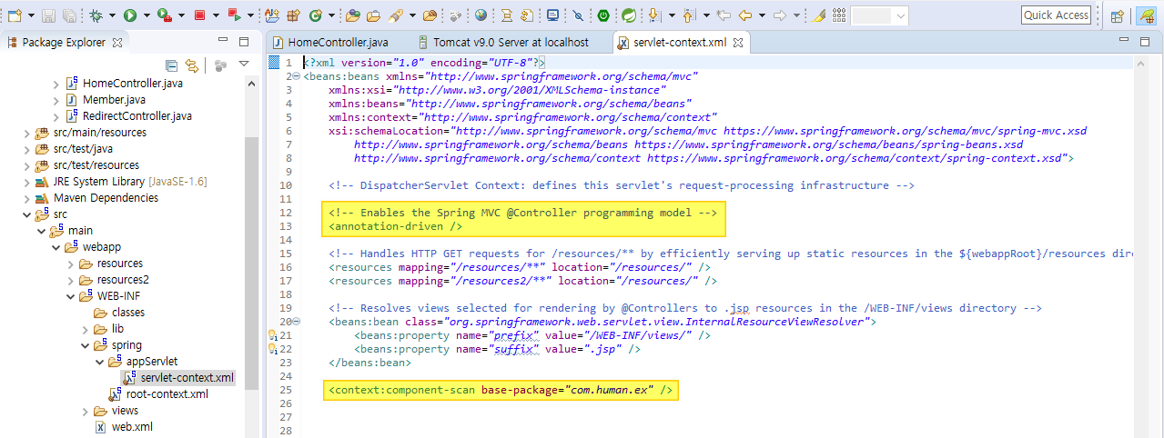 패키지 추가 시 맨 밑에 <context:component-scan vase-package="패키지.명" /> 추가