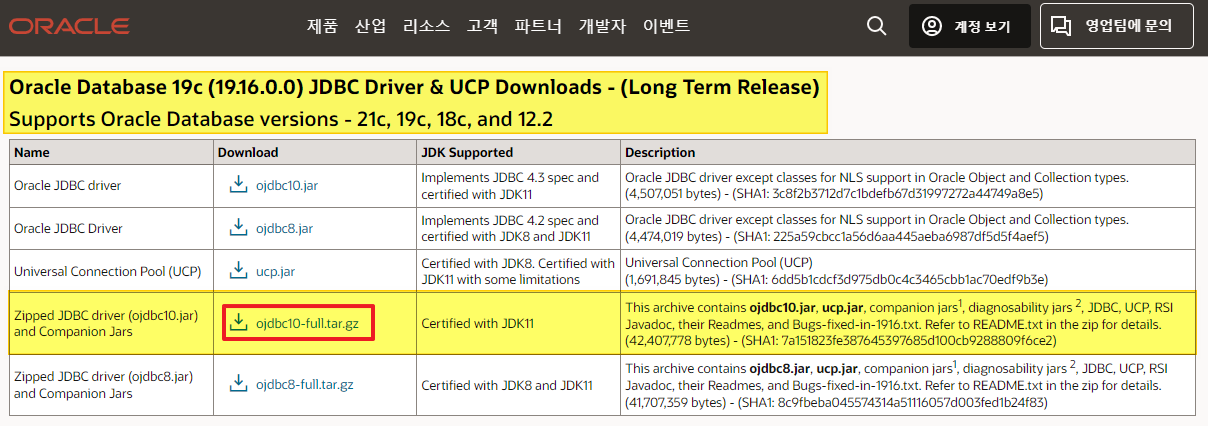 링크 : https://www.oracle.com/kr/database/technologies/appdev/jdbc-downloads.html